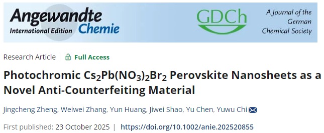 J. Zheng, W. Zhang, Y. Huang, J. Shao, Yu Chen, Y. Chi, Photochromic Cs2Pb(NO3)2Br2 Perovskite Nanosheets as a Novel Anti-Counterfeiting Material Angew. Chem. Int. Ed. 2025, e202520855. https://doi.org/10.1002/anie.202520855